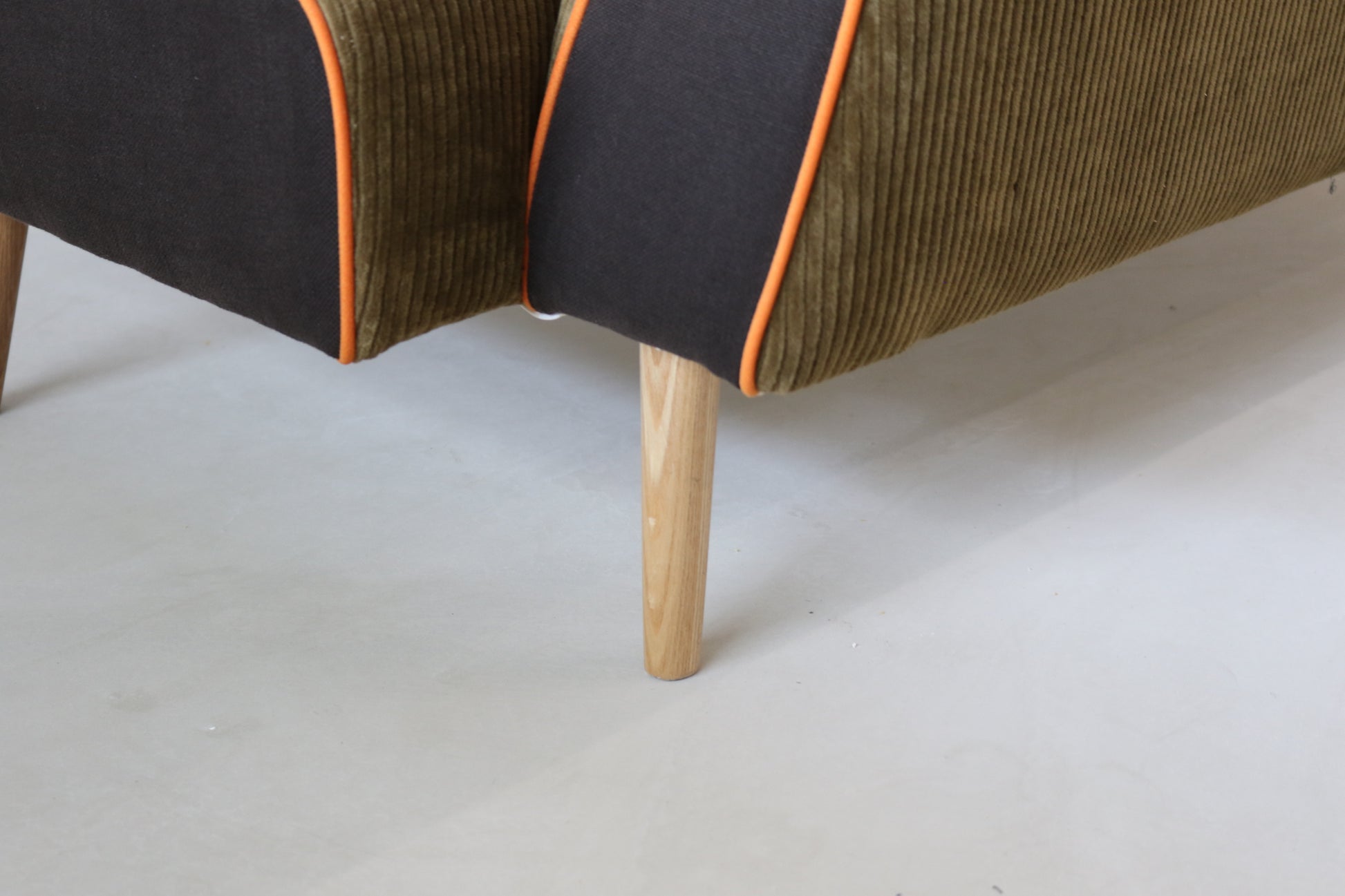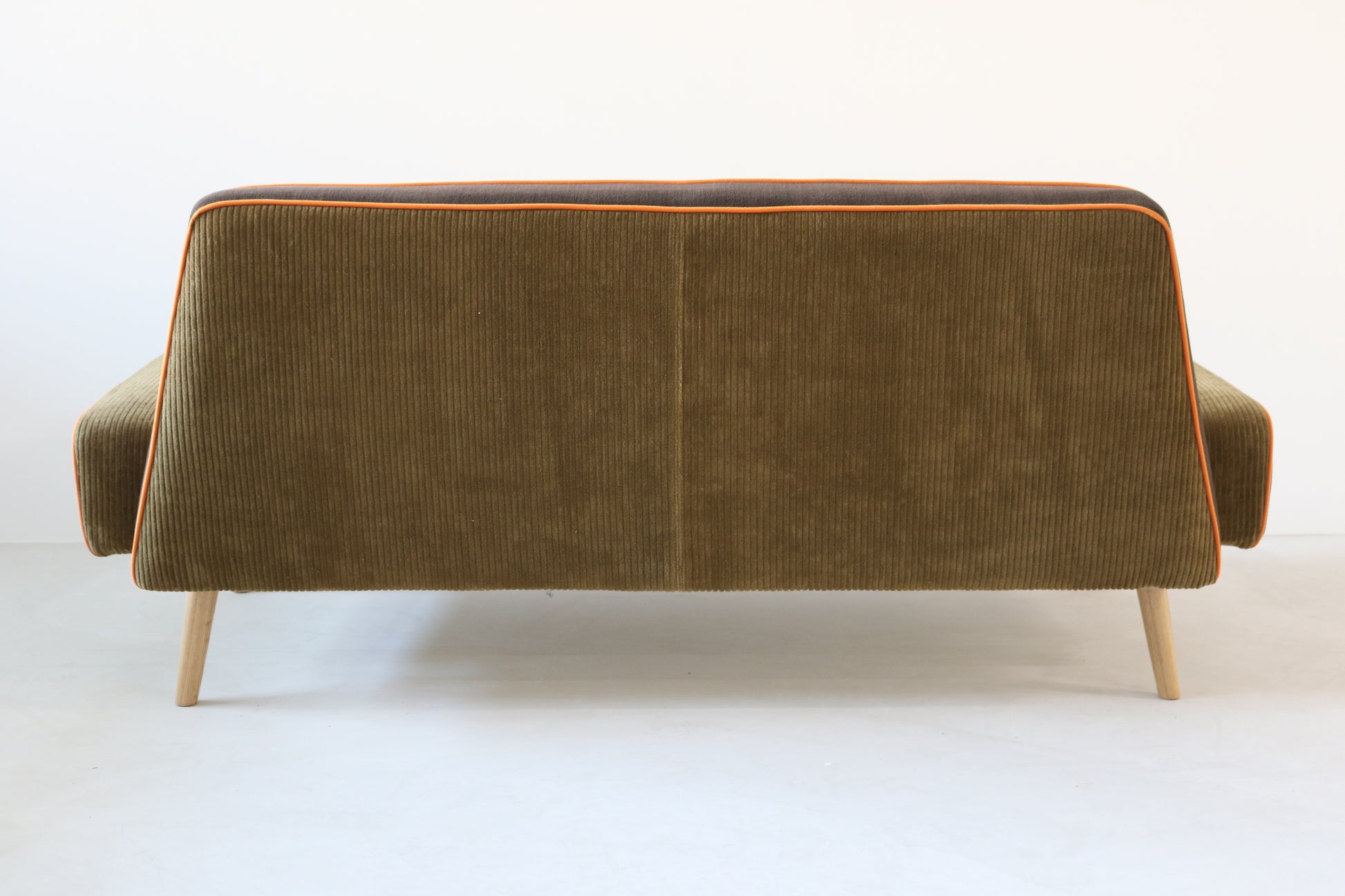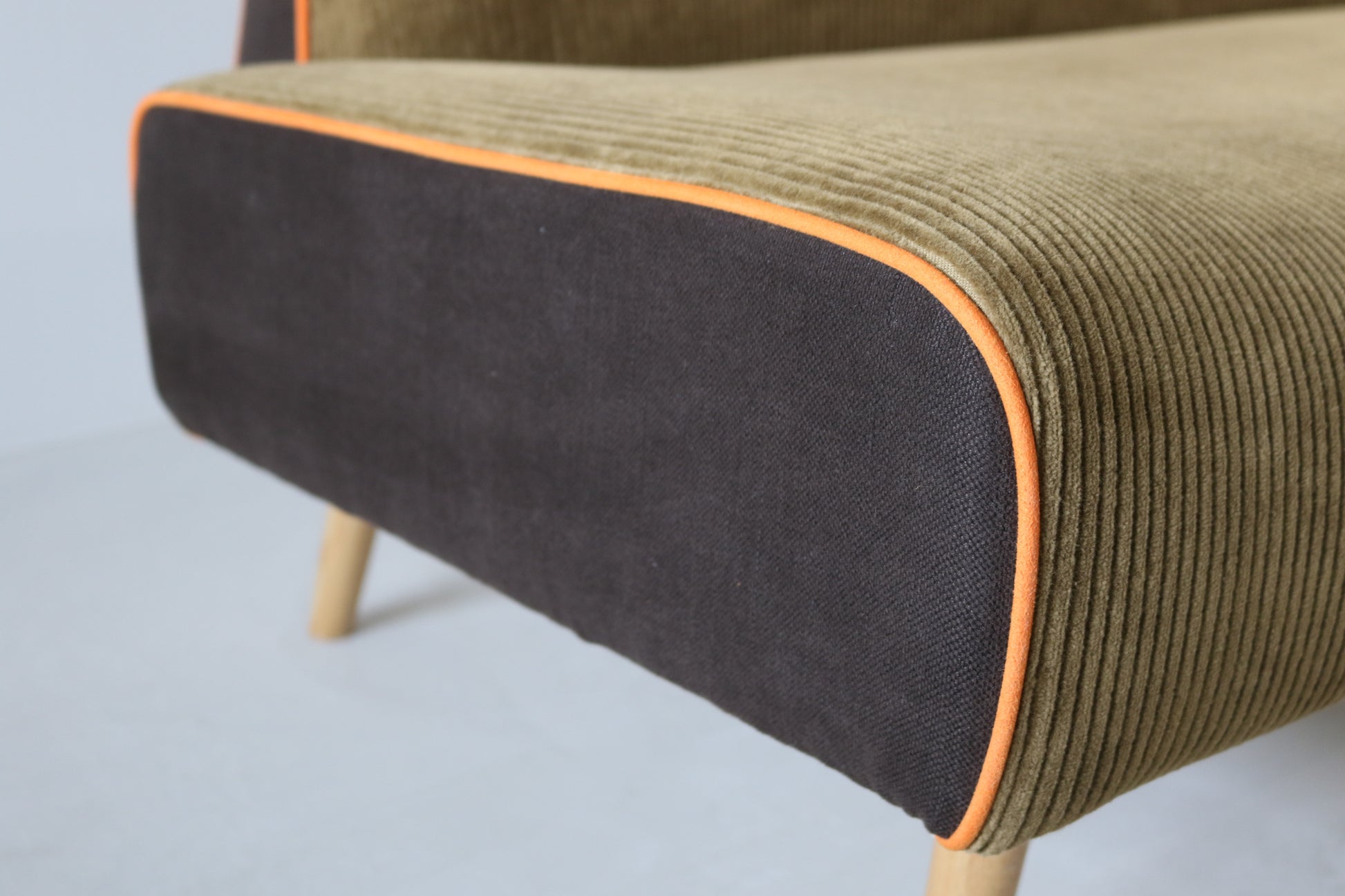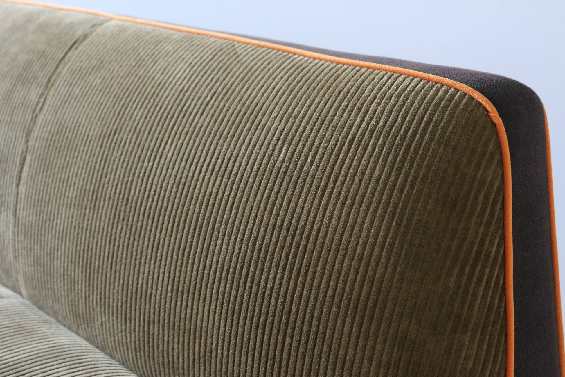カーキ×ブラウンのカジュアルシックな色合いに、ポップなオレンジのパイピングがポイントの遊び心ある配色ソファに仕上がりました。