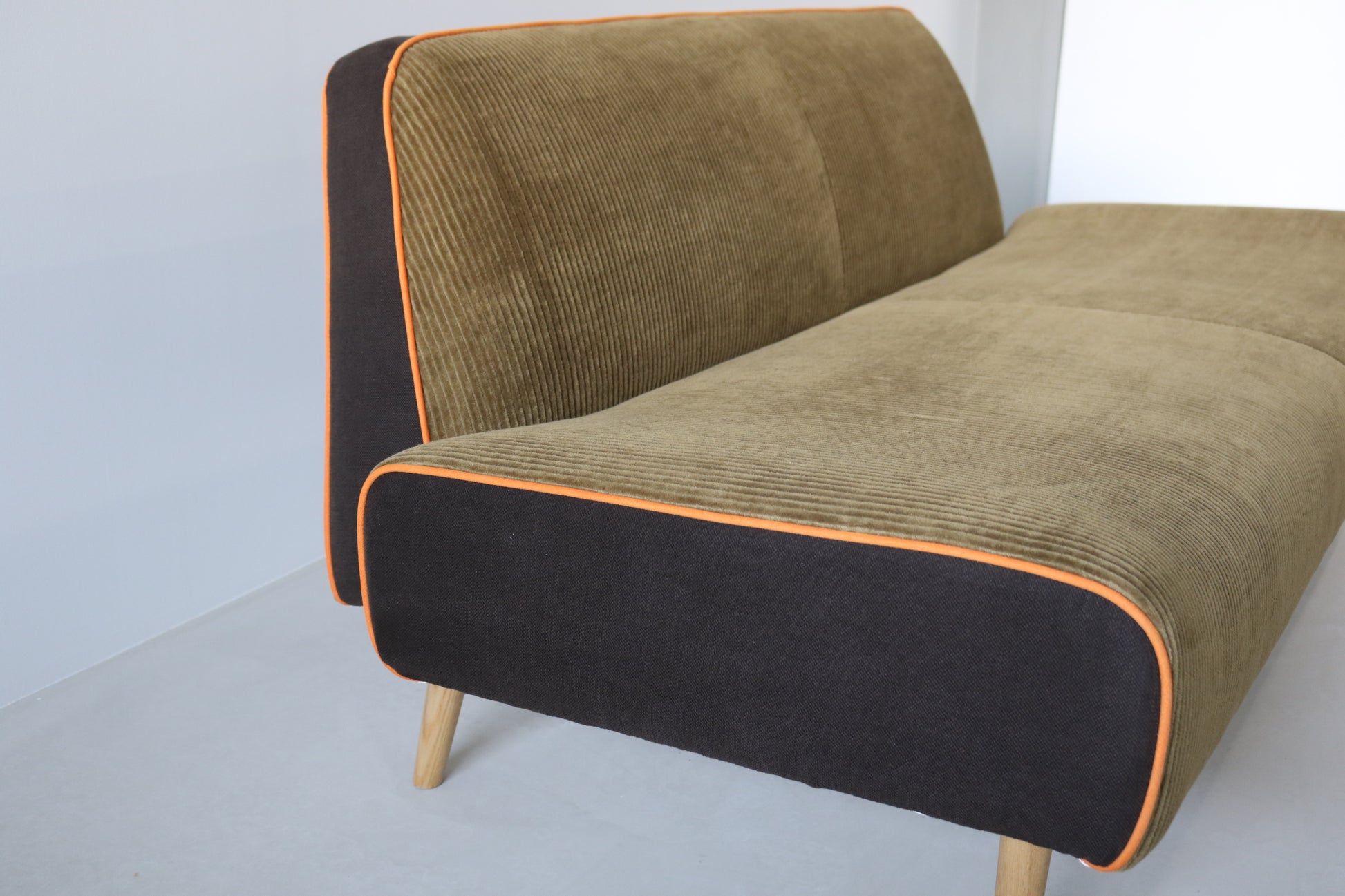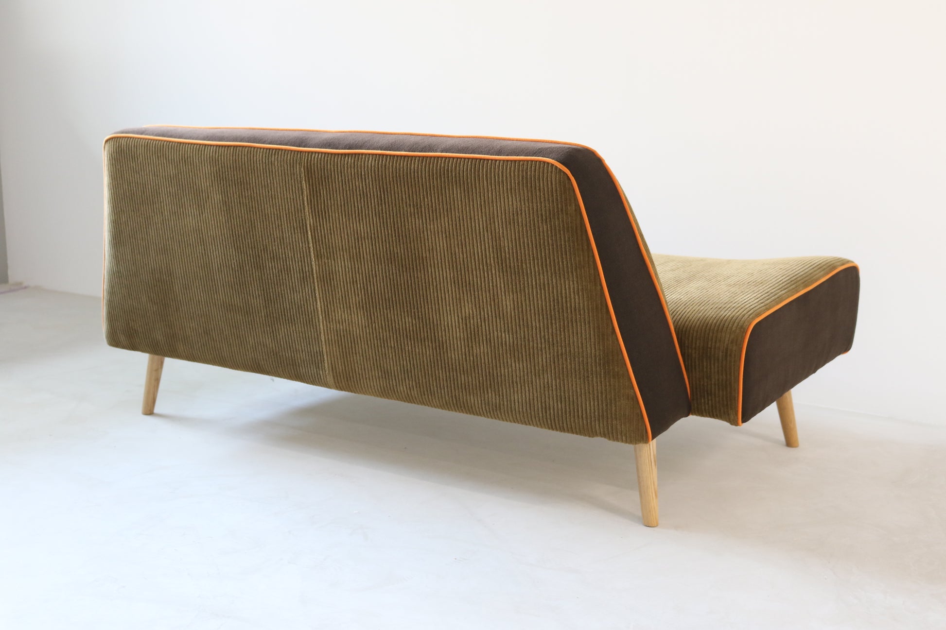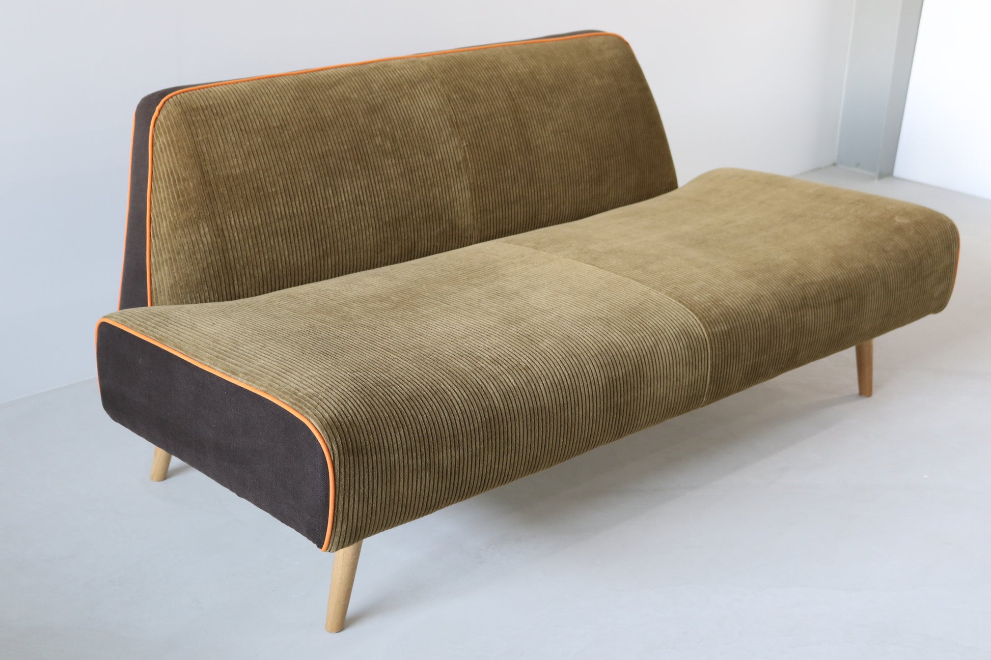 カーキ×ブラウンのカジュアルシックな色合いに、ポップなオレンジのパイピングがポイントの遊び心ある配色ソファに仕上がりました。