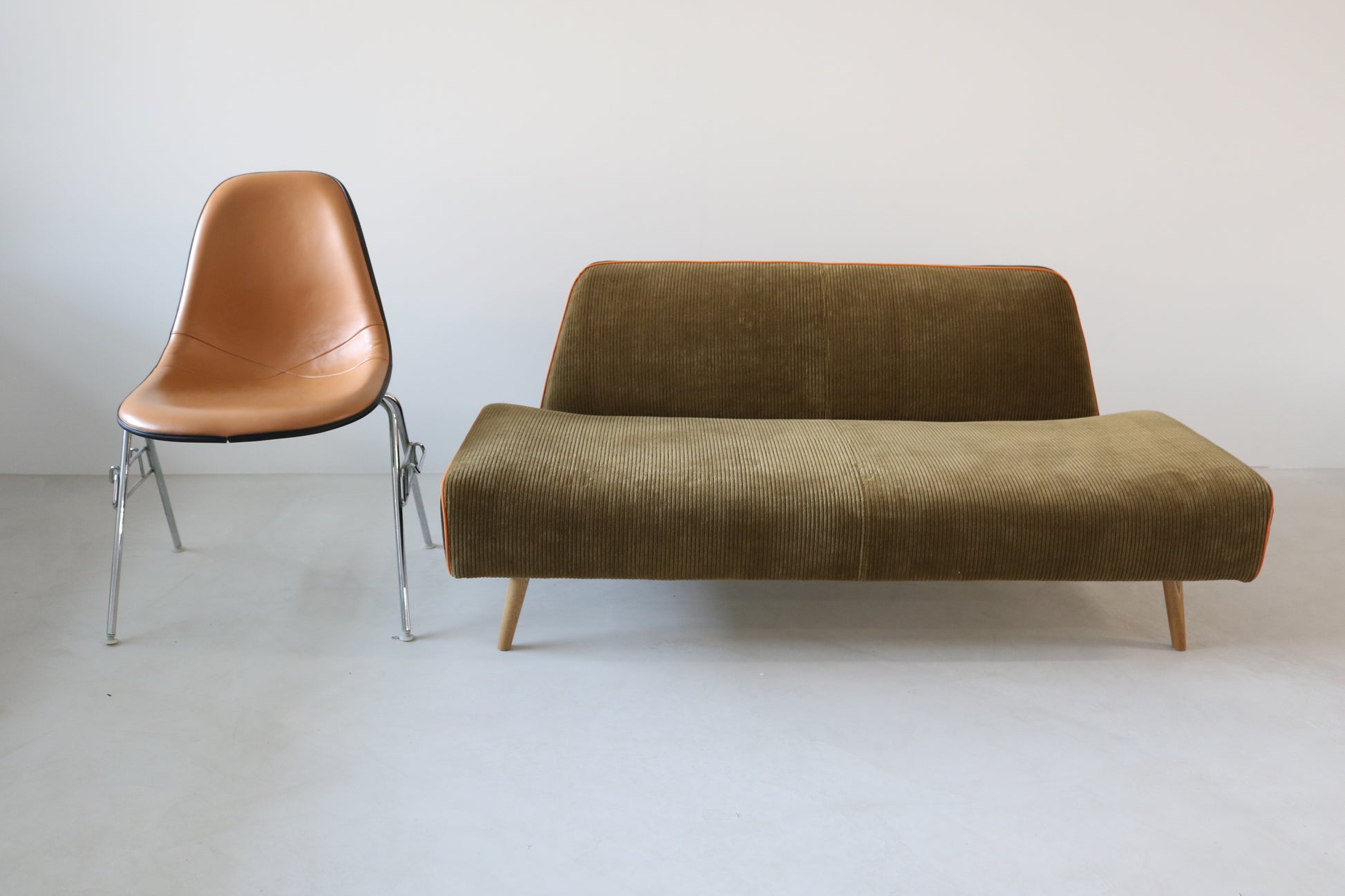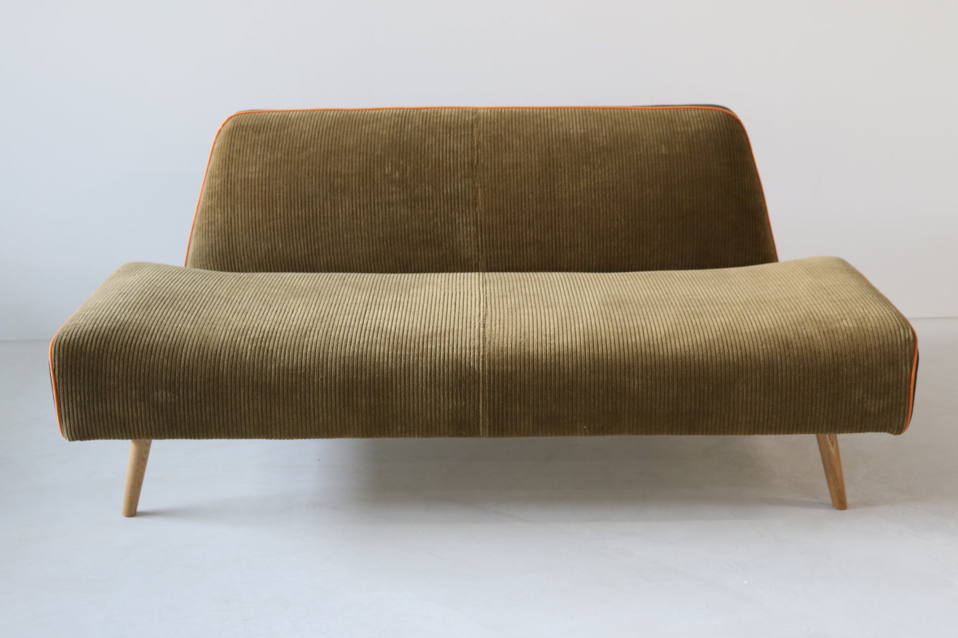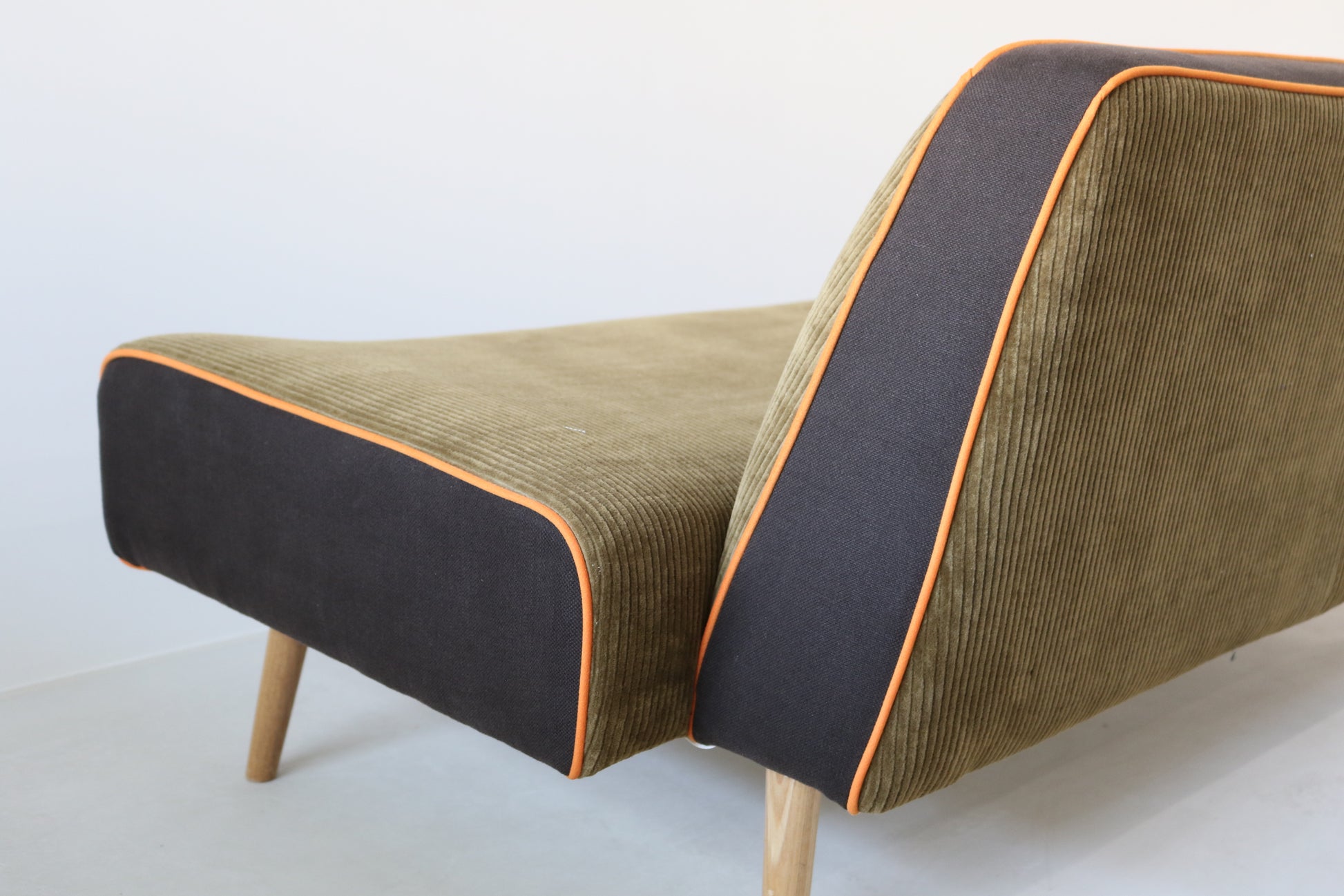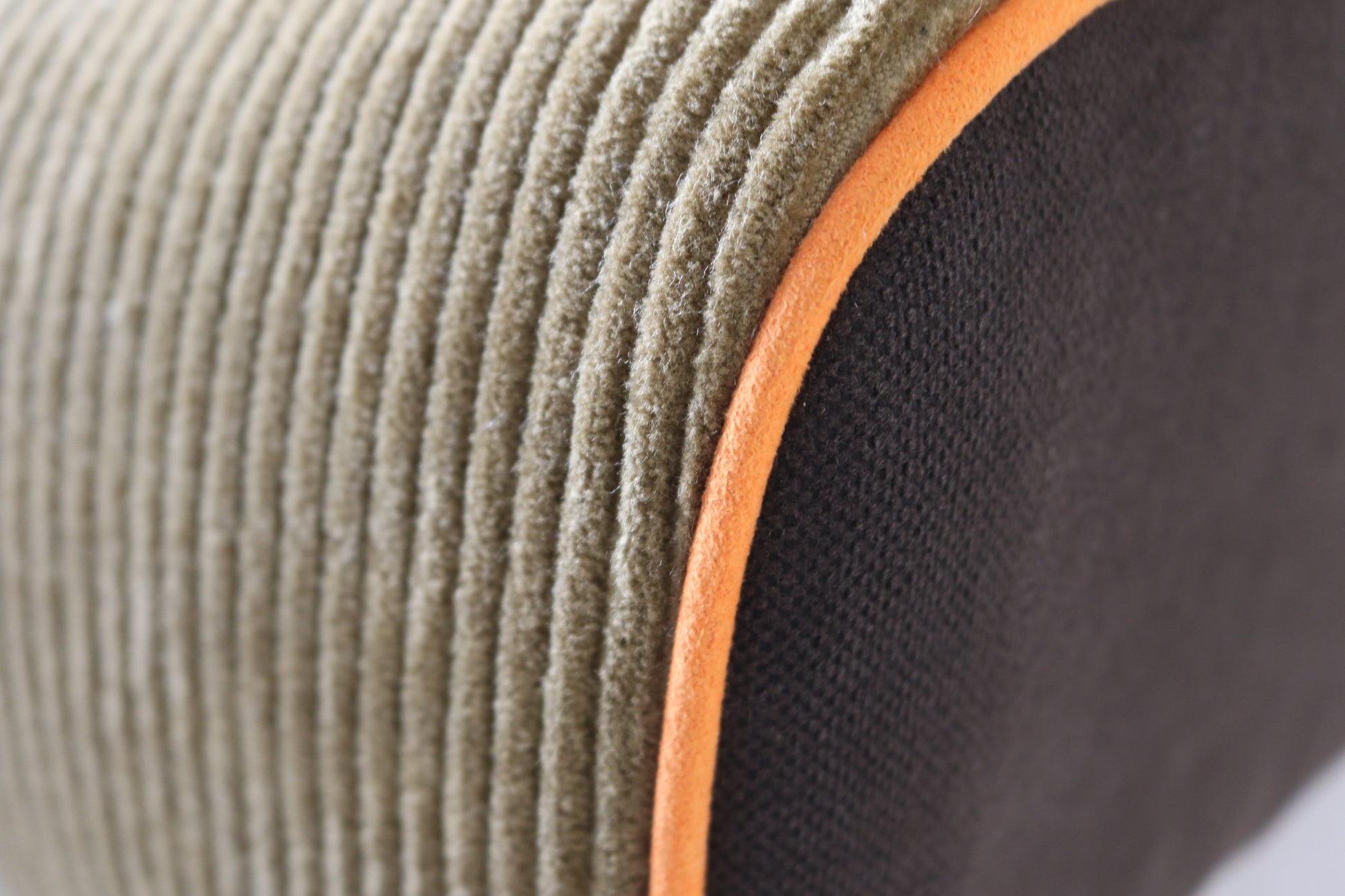 カーキ×ブラウンのカジュアルシックな色合いに、ポップなオレンジのパイピングがポイントの遊び心ある配色ソファに仕上がりました。